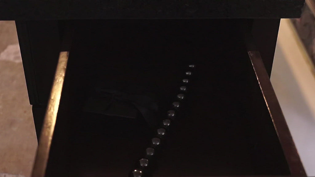 La ebanistería a la vista, está elaborada en madera sólida de Cedro. En los costados se disimulan los frentes de los cajones que tienen un mecanismo de cerrado lento.